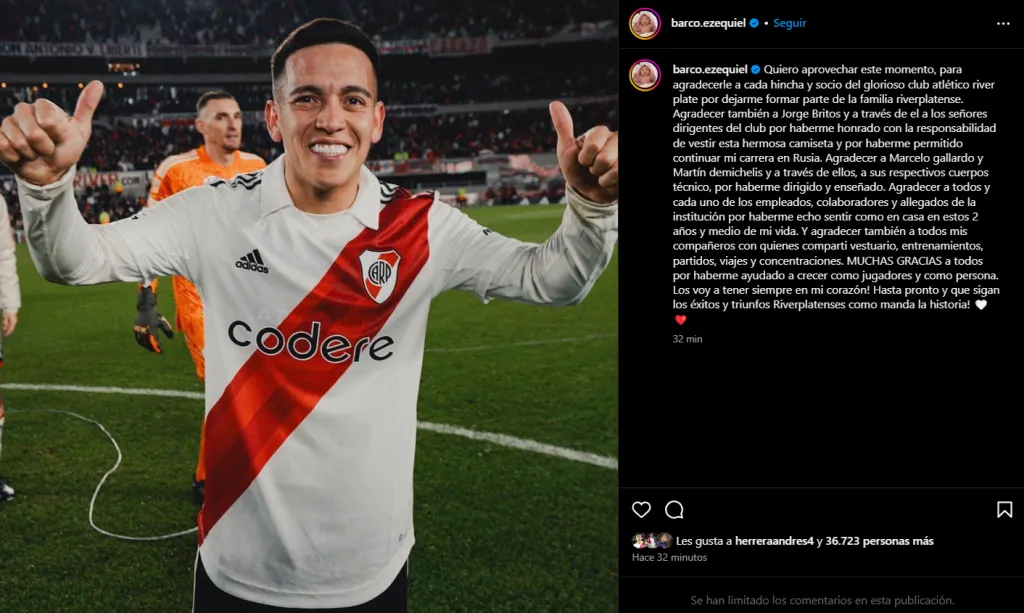 Esequiel Barco se despidió de la gente de River. Tras haber sido presentado en Spartak Moscú, el mediocampista hizo un posteo en sus redes sociales dirigido a los hinchas y a todos los que forman parte del club. Entre ellos, hubo una mención para los entrenadores.