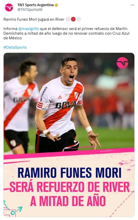 Es así que, en la tarde del jueves, el periodistaMaximiliano Grillo entregó el “bombazo” informativo del día en TNT Sports para alegrarle la jornada a los hinchas de La Banda que pedían por el regreso de uno de los surgidos en el club: “Ramiro Funes Mori es nuevo jugador de River”.