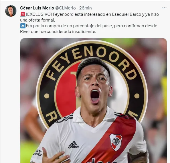 A 12 días de que finalice la ventana de fichajes en el fútbol europeo, en el Millonario están atentos a los intereses que pueden venir desde allí por sus jugadores, tal como pasó como Lucas Beltrán, y en las últimas horas llegó un ofrecimiento por Esequiel Barco.
