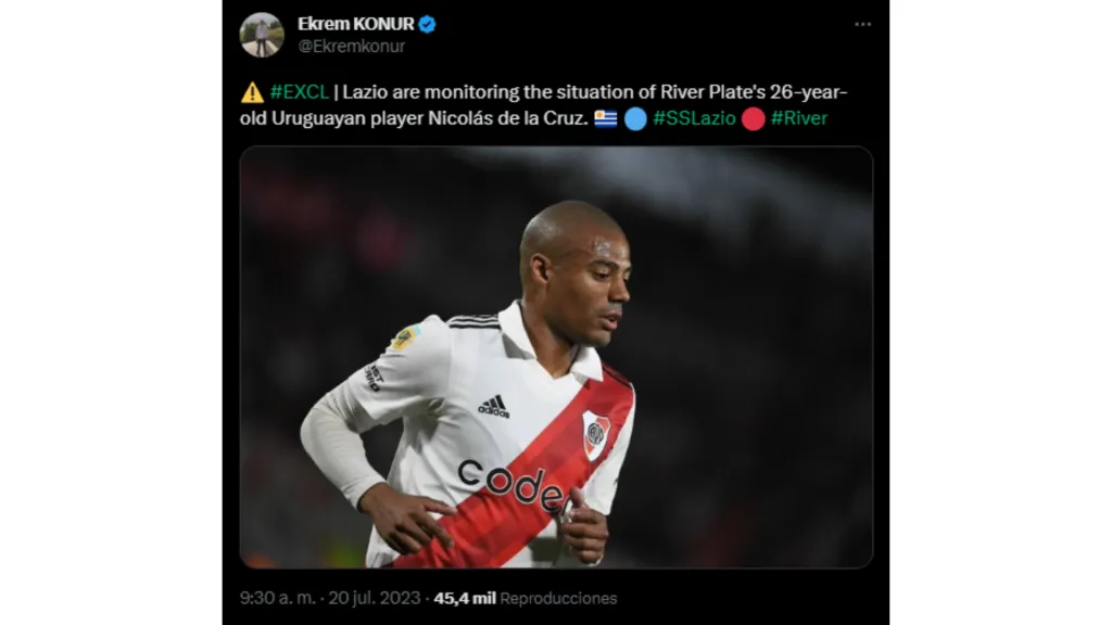 En este contexto, su salida de River ahora sí podría darse ya que, según trascendió, desde Europa están buscando a De La Cruz desde un gigante de Italia como la Lazio. El encargado de revelan esta información fue el periodista turco Ekrem Konur, especialista en el mercado de pases del viejo continente.