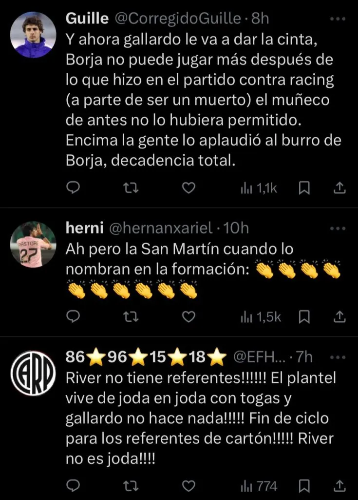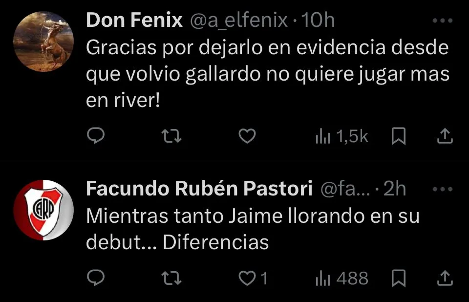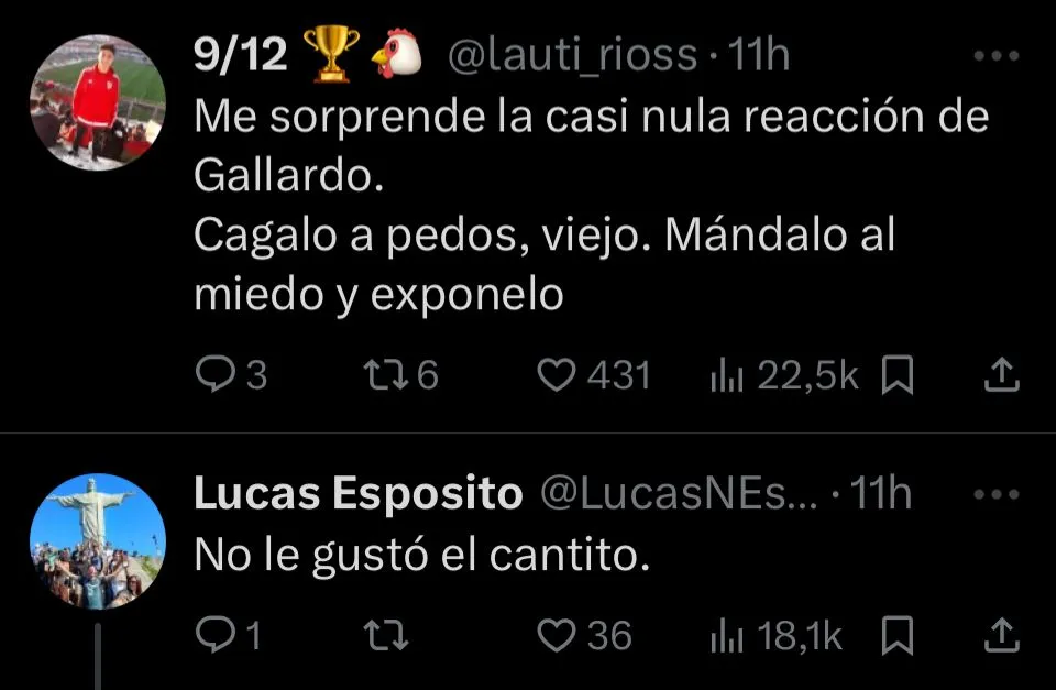 El detalle que agiganta la escena es que, en su apurada retirada, fue el primer futbolista en pasar por el costado de Marcelo Gallardo, quienes no intercambiaron mirada o gesto alguno. El entrenador, lejos de escapar al clima, se quedó al borde del campo de juego, esperando a la salida de cada uno de sus dirigidos para ser el último en abandonar la cancha. De todas formas, la imagen no es más que una radiografía del complejo presente riverplatense: un equipo golpeado que todavía no levanta cabeza.