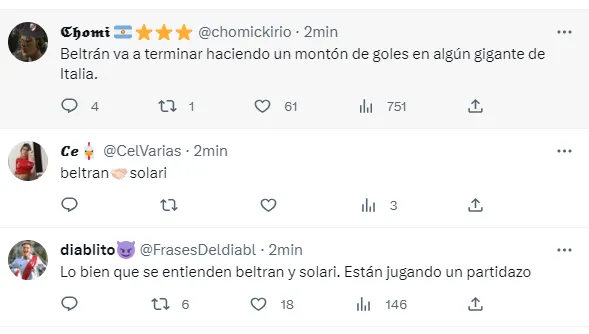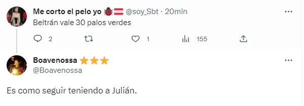 “Beltrán vale 30 palos verdes”, dicen algunos hinchas por su valor ante el interés de algunos equipos de Europa, mientras que otros afirman que “Es como seguir teniendo a Julián”, debido a la similitud que tiene en la forma de jugar.