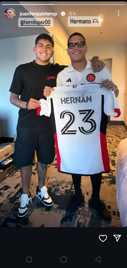 Hernán López Muñoz, ex compañero de Juanfer en River, lo fue a visitar a la concentración y le llevó un regalo: su camiseta de San Jose Earthquakes. El talentoso mediocampista llegó a la MLS en mayo de este 2024 tras la eliminación de Godoy Cruz en los cuartos de final de la Copa de la Liga. El elenco de California compró el pase del enganche por 7 millones de dólares, de los cuales se dividió en partes iguales entre el Millonario y el Tomba, que compartían el pase del futbolista.