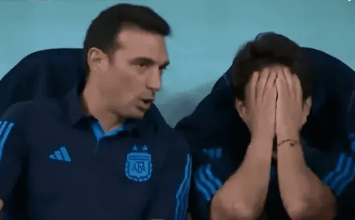 Pablo Aimar,ayudante de campo e ídolo deLionel Messituvo una emotiva reacción tras el gol del 10, rompió en llanto en el banco de suplentes, desahogando los nervios del partido,mientras queScaloni y Walter Samuelconversaban para hacer nuevos cambios.