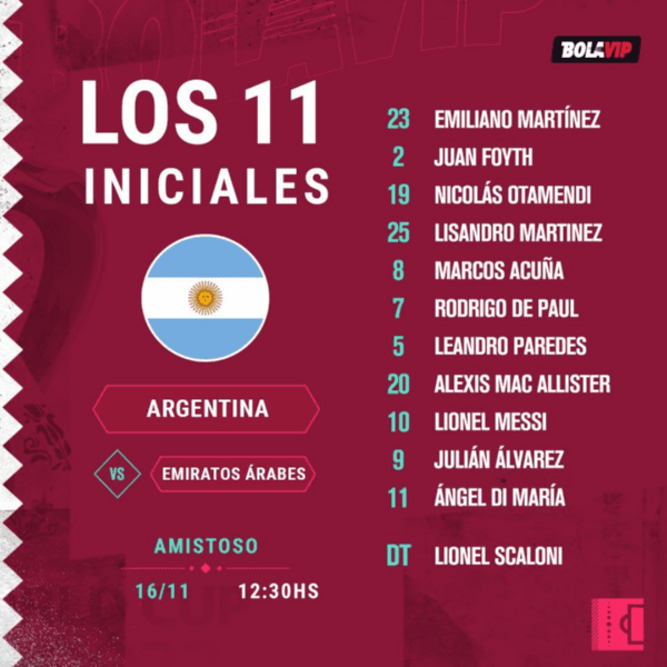 La Selección Argentina enfrentará a Emiratos Árabes en lo que será el último duelo antes del inicio de la Copa del Mundo. Cuando parecía que Lionel Scaloni iba a guardar varios nombres pensando en Arabia Saudita, aparecieron mayoria de titulares en la alineación.