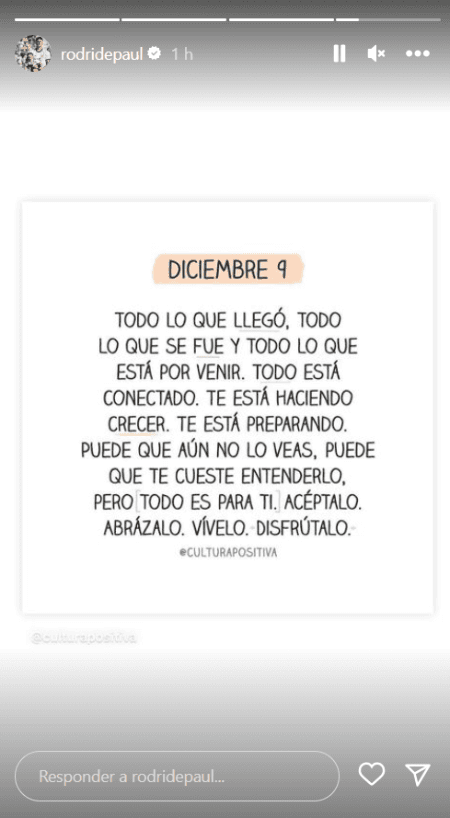“Todo lo que llegó, todo lo que se fue y todo lo que está por venir. Todo está conectado. Te está haciendo crecer. Te está preparando. Puede que aún no lo veas, puede que te cueste entenderlo, pero todo es para ti. Acéptalo. Abrázalo. Vívelo. Disfrútalo”, reposteó el jugador alrededor de las 11 de la mañana de Argentina.