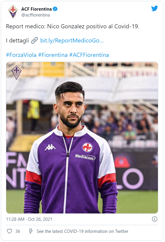 Se trata de Nicolás González, cuyo parte médico se dio a conocer a través de la Fiorentina. “Se encontró un caso positivo en las pruebas preventivas para la detección de Covid-19.El titular de la tarjeta en cuestión es NicoGonzálezquien es asintomático y ya se encuentra en aislamiento”.
