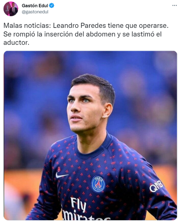 En línea con la información de Gastón Edul, su hermano Esteban confirmó en ESPN F12 que Paredes será baja por, al menos, dos meses para cualquier actividad deportiva y corre riesgo su participación en los duelos de la Selección Argentina programados para junio, contra Italia (Finalissima) y Brasil (Eliminatorias). Se aguarda parte médico oficial del PSG.