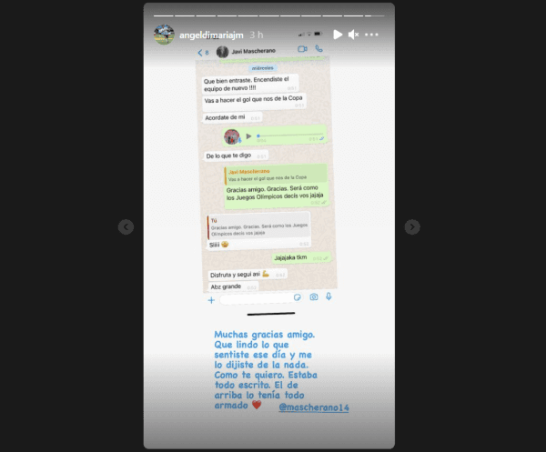 “Muchas gracias amigo. Que lindo lo que sentiste ese día y me lo dijiste de la nada. Como te quiero. Estaba todo escrito. El de arriba lo tenía todo armado”, escribió ahora Di María, mostrando todos los detalles de la mencionada conversación con el exjugador con el que compartió grandes momentos en la Selección Argentina.