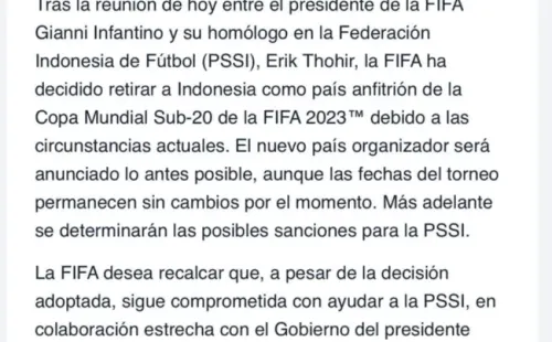 Finalmente, este miércoles confirmó lo que se esperaba mediante un comunicado: “La FIFA ha decidido retirar a Indonesia como país anfitrión de la Copa Mundial Sub-20 de la FIFA 2023debido a las circunstancias actuales”. Además, remarcó: “El nuevo país organizador será anunciado lo antes posible, aunque las fechas del torneo permanecen sin cambios por el momento. Más adelante se determinarán las posibles sanciones para la PSSI”.
