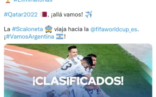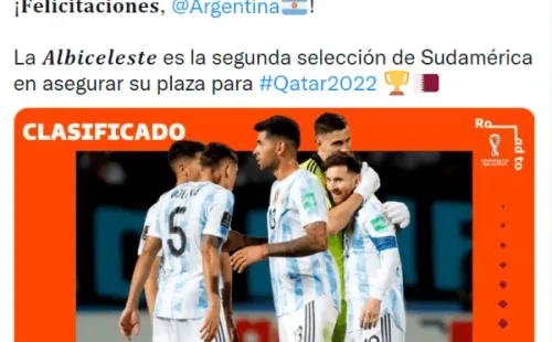 Apenas se concretó la clasificación, la Selección comunicó la noticia en sus redes sociales con muchísima alegría y escribió: “Qatar 2022, ¡allá vamos!”. A continuación, la propia FIFA fue la encargada de darle a la Albiceleste la cálida bienvenida a la próxima cita grande del fútbol y así lo expresó en su cuenta oficial de Twitter. “¡Felicitaciones Argentina!La Albiceleste es la segunda selección de Sudamérica en asegurar su plaza para Qatar 2022”, posteó la entidad madre.