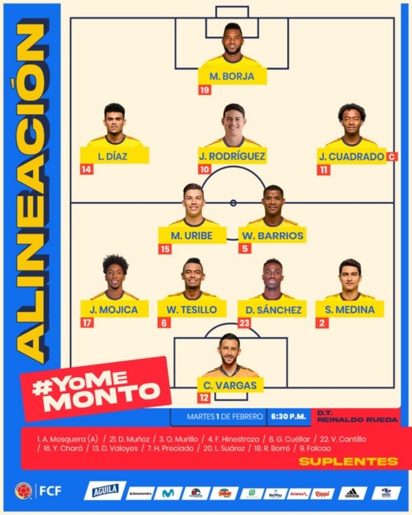 Camilo Vargas; Stefan Medina, Davinson Sánchez, William Tesillo, Johan Mojica; Wilmar Barrios, Mateus Uribe; Juan Guillermo Cuadrado, James Rodríguez, Luis Díaz; Miguel Borja. DT: Reinaldo Rueda.