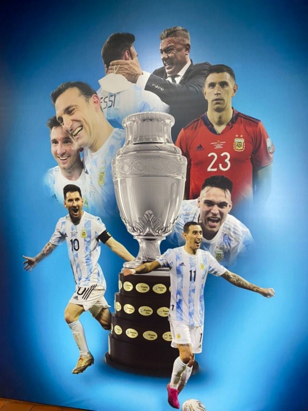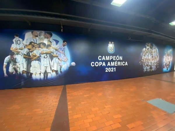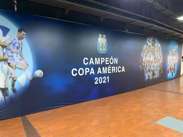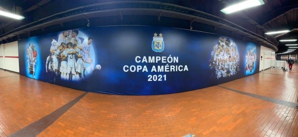 “Campeón Copa América 2021”, dicen las imágenes que ya empapelan el interior de la cancha de River a la espera del cruce de la Albiceleste ante Bolivia. Lionel Messi, el trofeo y el plantel unido, fotos que no podían faltar para graficar el semejante hito de la Selección después de cortar la sequía de 28 años sin títulos en la Mayor.