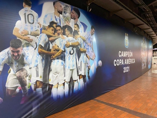 Para semejante recibimiento, el Estadio Monumental ya se está vistiendo de gala a tan solo un día del regreso de la Selección Argentina a Núñez. En el anillo del Antonio Vespucio Liberti se colocaron diversas gigantografías, ilustrando la histórica conquista de los de Scaloni ante Brasil por la Copa América.
