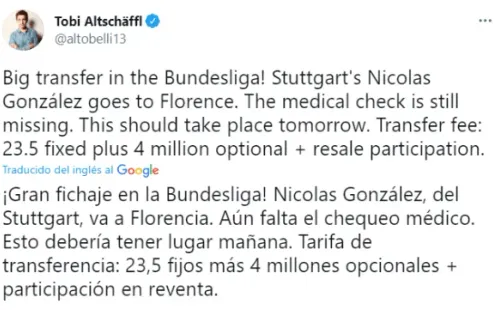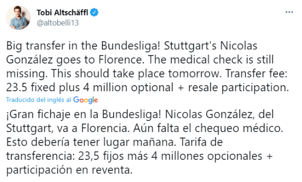 Además de la gran noticia de Rodrigo De Paul, el periodistaTobi Altschäffl, del prestigioso diario alemán Bild, comunicó queNicolás González será nuevo jugador de la Fiorentinapor un valor aproximado a los 30 millones de euros. La cifra se dividiría en 23,5 millones por la transferencia y otros 4 más en variables que podrían ir en aumento. Sin dudas, una gran noticia para la Selección Argentina.