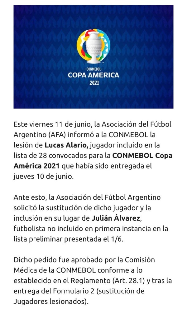 La nómina difundida por la casa madre del fútbol sudamericano -y la presentada por Argentina-incluía originalmente al delantero del Bayer Leverkusen en sus filas. Sin embargo, la Selección decidió acudir al Artículo 28.1 del Reglamento de CONMEBOL para hacer ingresar a Julián Álvarezen lugar del Pipa, ya que el actual atacante de River no estaba incluido en la lista preliminar y esta era la única vía para que la Araña pudiera estar en la Copa América. La entidad organizadora aceptó y es un hecho: Álvarez viaja a Brasil.