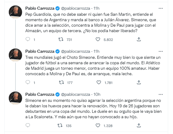 En la previa del partido ante el Almazán por la Copa del Rey, escribió: “Tres mundiales jugó el Choto Simeone. Entiende muy bien lo que siente un jugador de fútbol a una semana de arrancar la copa del mundo. El Atlético de Madrid juega un torneo menor, contra un equipo 100% amateur. Haber convocado a Molina y De Paul es, de arranque, mala leche”.