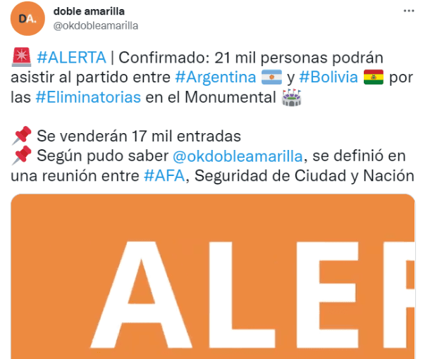 Según pudo confirmar el medio Doble Amarilla, el último duelo de la Albiceleste en la triple fecha de Eliminatorias contará con la asistencia de 21 mil personas en el Monumental, siendo el regreso oficial del público a un estadio del fútbol argentino. La medida se determinó en una reunión entre la Asociación del Fútbol Argentino, la Seguridad de Ciudad y el Gobierno Nacional.