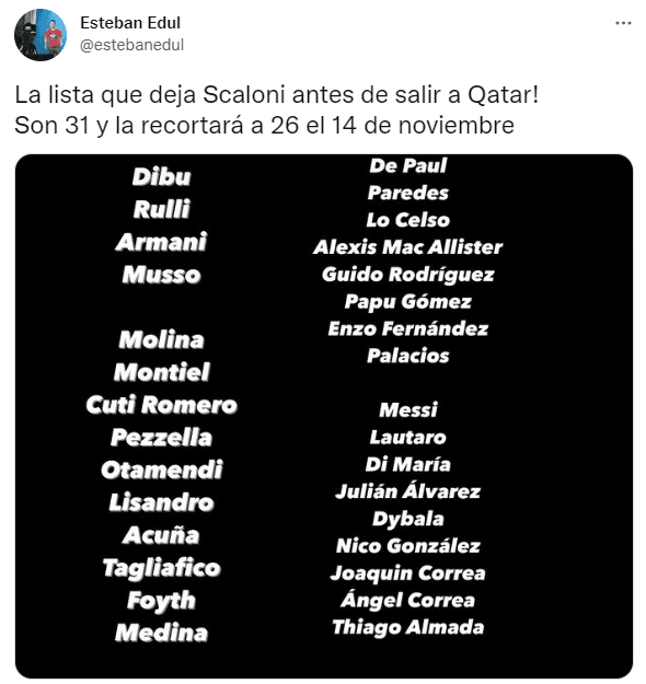 En línea con la información que entregó Esteban Edul, son 31 los nombres que dio Scaloni en las últimas horas para luego hacer el último recorte y decidir a los 26 definitivos que competirán en Qatar. El periodista de ESPN confirmó grandes sorpresas: Facundo Medina y Thiago Almada están entre los últimos preseleccionados para el Mundial.