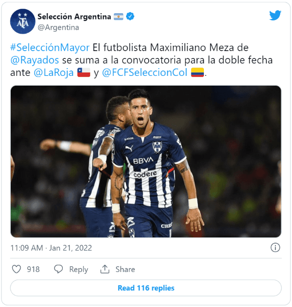 La novedad pasa por el regreso de Maximiliano Meza a la Selección. El ex-Independiente, actualmente en Rayados de México, se suma a la lista de Lionel Scaloni buscando meterse en su consideración. El volante disputó la Copa del Mundo 2018 y fue varias veces citado por Jorge Sampaoli.