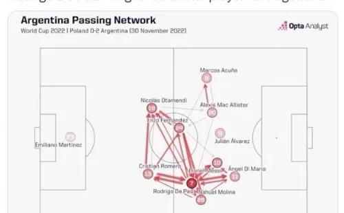 El volante de Atlético Madrid superó las márcas establecidas por Javier Mascherano (133 contra Islandia en 2018) y Juan Sebastián Verón (132 contra Grecia en 2010) de pases completados en un mismo partido de la Selección Argentina en unaCopa del Mundo. Casi todas las jugadas tuvieron participación de De Paul y el gráfico de The Analyst también da cuenta de ello: a mayor grosor, más volumen de pases hubo. Un verdadero pulpo.