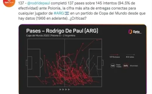 Y, por si hiciera falta, las estadísticas reflejan lo vital que fue la labor del surgido en Racing. En línea con la información de Opta, De Paul completó 137 pases sobre 145 intentos (94.5% de efectividad) y registró un nuevo récord históricodesde que se tienen datos de Mundiales a partir de la edición deInglaterra 1966.