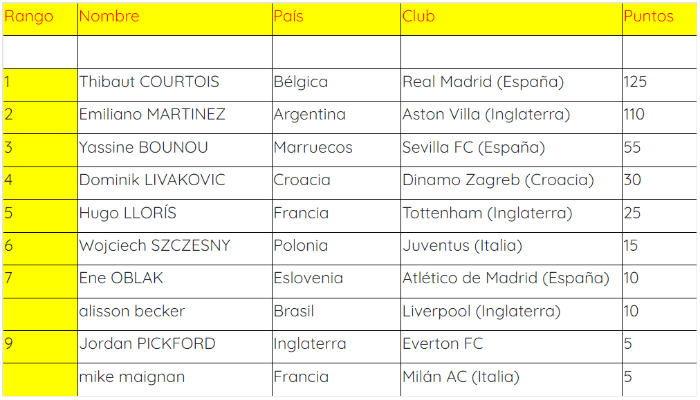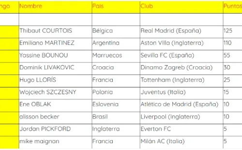 El podio lo completa Yassine Bounou (55), otro que sumó mucho por su actuación mundialista, que se convirtió en el primer africano en meterse en el top 3. Más abajo aparece Dominik Livakovic (30), clave para Croacia; y Hugo Lloris (25), capitán de la Selección de Francia.
