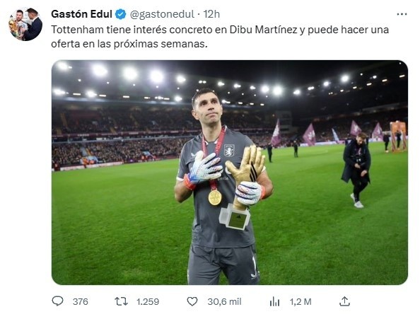 Los rumores comenzaron desde el diario inglésThe Sun, pero finalmente fue Gastón Edul quien se animó a tirar el nombre del posible destino de Martínez en su carrera profesional. “Tottenham tiene interés concreto en Dibu Martínez y puede hacer una oferta en las próximas semanas”, informó el periodista deTyC Sportsa través de su cuenta de Twitter.