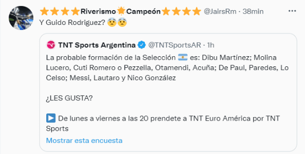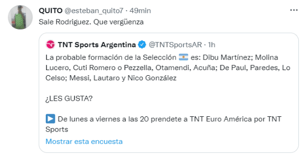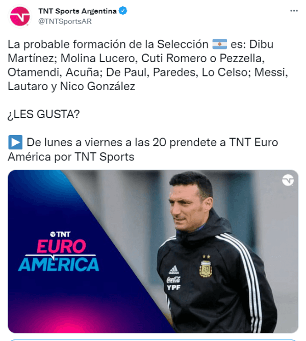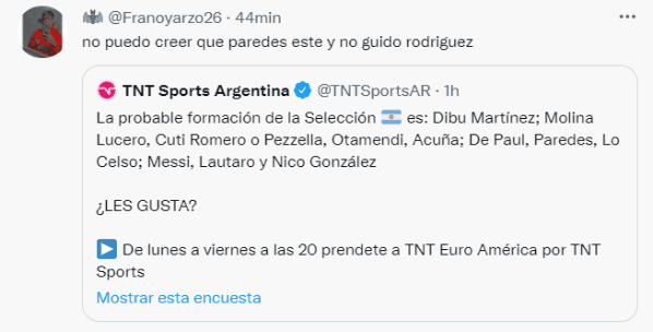A un día del choque contra Ecuador, Scaloni solo confirmó la presencia de Lo Celso en el mediocampo y nada más. Sin embargo, la cuenta de Twitter de TNT Sports publicó la posible formación de la Selección Argentina con una ausencia que hizo explotar de ira a gran parte de la hinchada. Según el medio deportivo, Leandro Paredes le habría ganado la pulseada a Guido Rodríguez y jugaría mañana contra los de Alfaro.