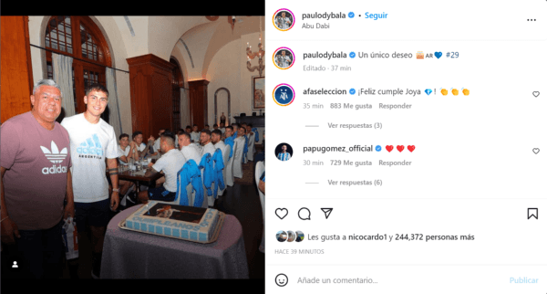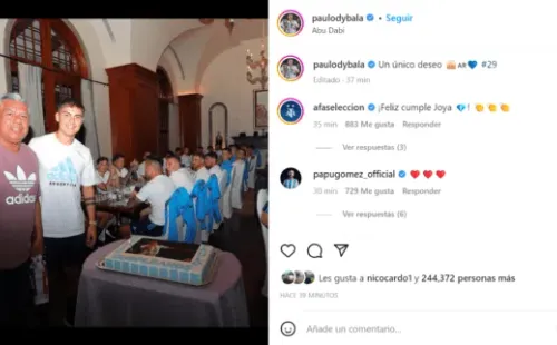 Para celebrar su cumpleaños 29, Dybala se fotografío al lado del presidente de la Asociación del Fútbol Argenitno, Claudio Tapia, y con el plantel de fondo. Además, se observó una torta celeste y blanca con una imagen del zurdo en la Selección Argentina. Pero lo que generó una gran reacción entre los hinchas fue el deseo del nacido en Laguna Larga.