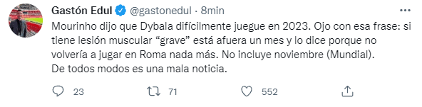 Para calmar las aguas, Gastón Edul, periodista que cubre la actualidad de la Selección Argentina en TyC Sports, lanzó un tuit que explica lo dicho por Mourinho. “Ojo con esa frase: si tiene lesión muscular graveestá afuera un mes y lo dice porque no volvería a jugar en Roma nada más. No incluye noviembre (Mundial). De todos modos es una mala noticia”, publicó.