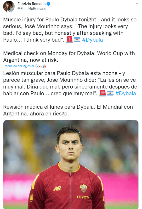 “Veo muy difícil que Paulo (Dybala) vuelva a jugar antes de que comience 2023. La lesión se ve mal,muy mal”, expresó el entrenador de la Roma luego del triunfo de su equipo contra Lecce. Las palabras de Mou rápidamente repercutieron en Argentina, sobre todo pensando en el Mundial.