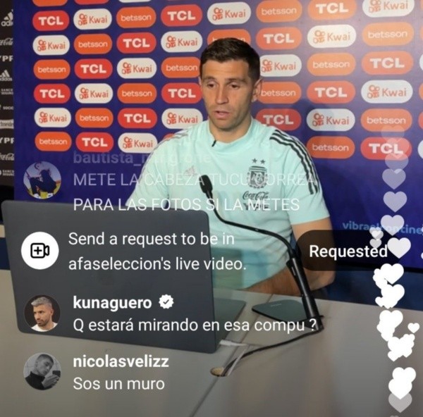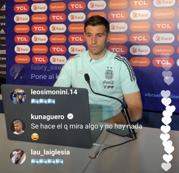 Durante la presentación del arquero del Aston Villa, el Kun Agüero volvió a meterse en el vivo de la cuenta oficial de Instagram de la Selección para dejar sus divertidos comentarios. El ahora delantero del Barcelona empezó a comentar en la transmisión mientras estaba hablando su compañero y, entre risas, tiró:“¿Qué estará mirando en esta compu? Se hace el que mira y no hay nada”. Un crack total.