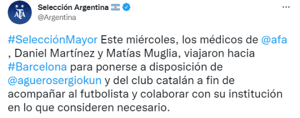 “Este miércoles, los médicos de AFA, Daniel Martínez y Matías Muglia, viajaron hacia Barcelona para ponerse a disposición de Sergio Agüeroyclub catalán a fin de acompañar al futbolista y colaborar con su institución en lo que consideren necesario”, posteó la cuenta oficial de Argentina en Twitter, en el marco de un gran gesto para el Kun en un difícil momento.
