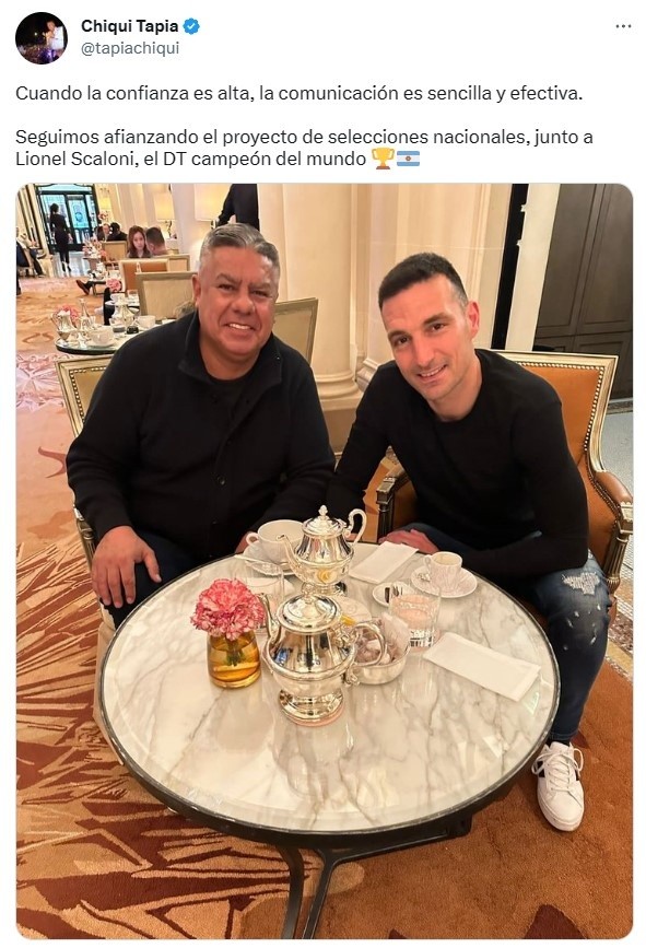 “Cuando la confianza es alta, la comunicación es sencilla y efectiva. Seguimos afianzando el proyecto de selecciones nacionales, junto a Lionel Scaloni, el DT campeón del mundo”, anunció Tapia a través de su cuenta oficial de Twitter para compartir su alegría con los fanáticos.