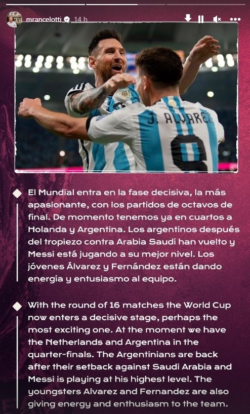 En su análisis por redes sociales,Carlo Ancelottile dedicó una breve columna a la Selección Argentina tras vencer a Australia en los octavos de final y comenzó por destacar a Lionel Messi. “Está en su mejor nivel”, escribió. Luego, el elogio fue para Enzo y Julián: “Le están dando energía y entusiasmo al equipo”.
