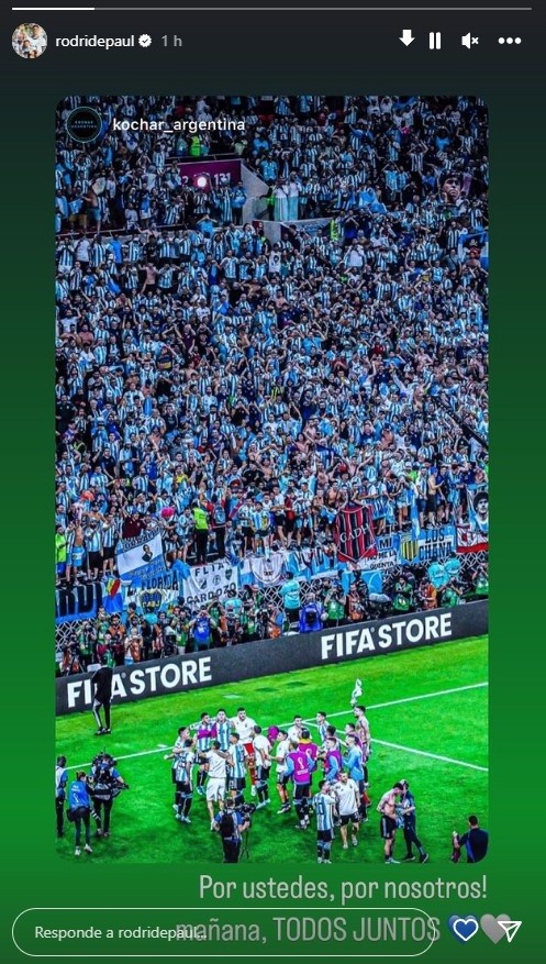 Minutos más tarde de la conferencia de Scaloni, donde afirma que el jugador “está bien”, fue el propio De Paul quien decidió salir nuevamente a escribirle a la gente a través de las redes sociales. “Por ustedes, por nosotros. Mañana todos juntos!”, posteó el mediocampista a través de sus historias de Instagram.