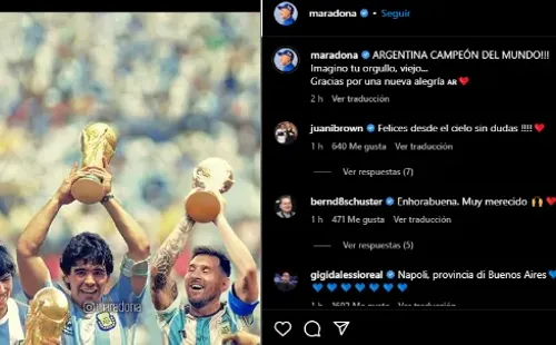 “ARGENTINA CAMPEÓN DEL MUNDO!!! Imagino tu orgullo, viejo… Gracias por una nueva alegría”, dice la publicación en las redes sociales que fue graficada con una imagen de Diego junto a Daniel Passarella y, lógicamente, con Lionel Messi levantando el trofeo en Qatar. La foto con la que todos soñamos.