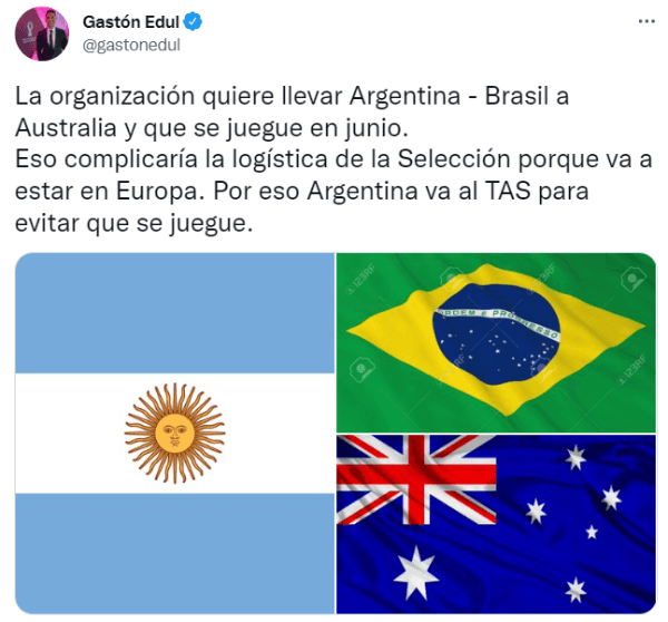 Según pudo confirmar Gastón Edul, periodista de TyC Sports, “la organización quiere llevar Argentina – Brasil a Australia”. De confirmarse, en un lapso de cortas semanas, la delegación de la Albiceleste tendrá que hacer un largo viaje para conectar entre Europa y Oceanía. Es por eso que, por este motivo, la AFA iría al TAS para hacer un pedido contundente.