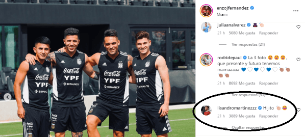 Pero, el volante surgido en Racing no fue el único que comentó en la publicación, ya que Lisandro Martínez se encargó de, a modo de chiste, escribir un apodo para Enzo. “Hijito“, le comentó el defensor del Manchester United a Fernández, junto con un emojide carcajada y unos aplausos. Sin dudas, la Selección Argentina es un grupazo. ¡Cracks!