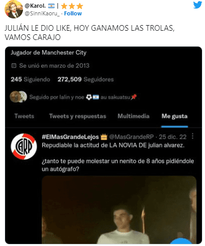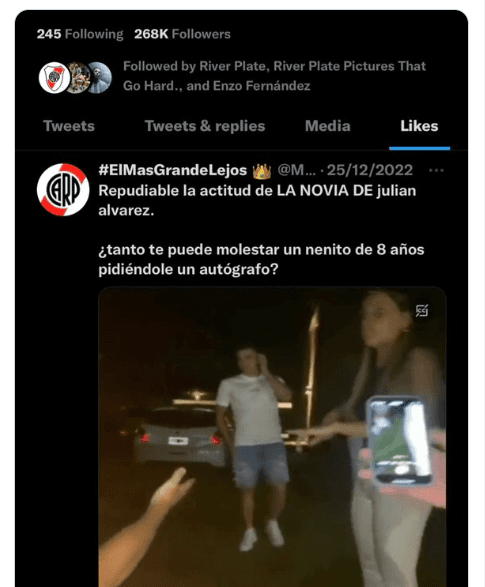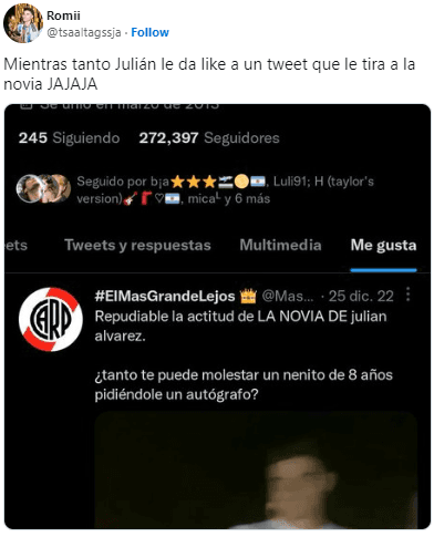 En ese contexto, algunos usuarios pasaban casualmente sobre el perfil de Julián Álvarez en Twitter y en el sector de los “likes” apareció una publicación que apuntaba a su actual pareja por su presunto accionar negativo con los niños en Córdoba.