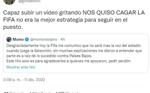 “Desgraciadamente hoy la FIFA me comunicó que no seré más la voz del estadio cuando juega la Selección,sin muchas explicaciones, me dieron a entender que parte es a raíz de lo sucedido contra Países Bajos”, expresó el influencer a través de Twitter para dar a conocer la noticia.