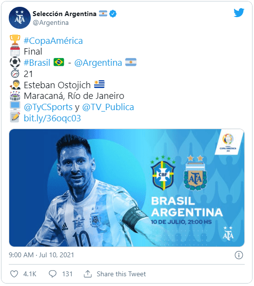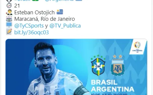 El mensaje publicado por la cuenta oficial de la Albiceleste fue plenamente informativo, repasando rival, horario, árbitro, estadio y los canales que transmitirán el compromiso. Además, utilizaron una gráfica con la imagen de Lionel Messi, el capitán que buscará dar su primera vuelta olímpica con esta camiseta.