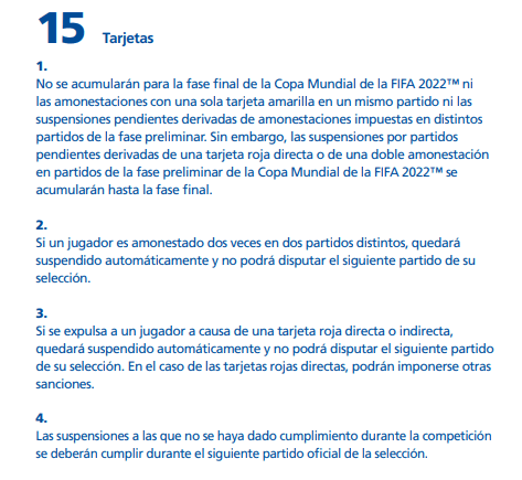 Con respecto a la acumulación de amarillas, la sanción no aplicaría para la cita grande que se llevará a cabo en Qatar. Los futbolistas argentinos Nicolás Otamendi, Lucas Martínez Quarta, Exequiel Palacios, Nicolás Tagliafico y Alexis Mac Allister están al borde de la suspensión, por lo que una amonestación contra Brasil los dejaría afuera del inicio de las próximas Eliminatorias rumbo al Mundial de 2026.