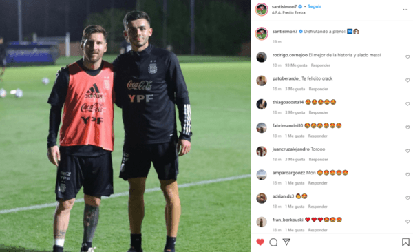 Uno de los grandes afortunados de la jornada fue Santiago Simón, quien expresó su felicidad en su cuenta oficial de Instagram con una increíble foto junto a Lionel Messi. El surgido en las inferiores de River posó con el 10 y Simón escribió al pie de la foto: “Disfrutando a pleno!”. El futbolista del Millo ya tenía un póster junto a la Pulga, pero hoy se entrenan a la par y el juvenil no dejó pasar la oportunidad de retratar el gran momento que atraviesa en el seleccionado.