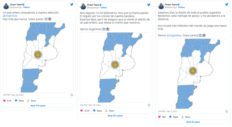El presidente de la AFA, desde Qatar, viene publicando una imagen del mapa de Argentina pintado con la bandera nacional. No lo publicó en la previa del duelo ante Arabia Saudita, pero después llegó para quedarse.