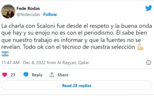 Un ratito después, cuando en las redes solo se hablaba de ese cruce entre el entrenador y el corresponsal, fue el propio Rodas quien puso paños fríos: “La charla con Scaloni fue desde el respeto y la buena onda qué hay y su enojo no es con el periodismo”.