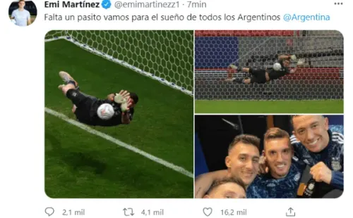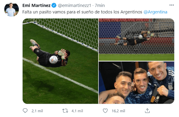 Apenas llegó al vestuario, después de seguramente responder mensajes de su familia y amigos, tiró un tuit con dos fotos suyas atajando y una con el resto de los arqueros del plantel: “Falta un pasito vamos para el sueño de todos los Argentinos”, expresó.