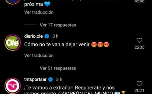 “Te vamos a extrañar”, le escribió Dibu, quien recibió muchísimos likes por parte de los fanáticos de la Selección Argentina. Incluso, aparecieron comentarios de influencers, cuentas deportivas y diferentes personalidades. Pero sus compañeros brillaron por su ausencia. ¿Definitivamente se rompió la relación?
