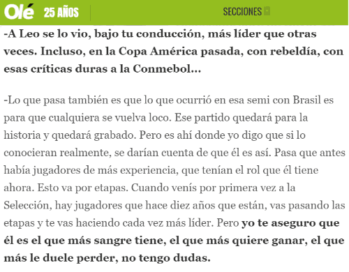 “Yo te aseguro que él es el que más sangre tiene, el que más quiere ganar, el que más le duele perder, no tengo dudas”, confesó el director técnico mientras hablaba del mismísimo Leo Messi, capitán de la Albiceleste y agregó: “Es el primero que cuando el entrenador necesita una mano, está.Siempre ha intentado hacer lo que el entrenador dice, en eso no tengo nada para decir. Pero a nivel humano es donde tiene nuestro apoyo porque es ahí donde marca la diferencia”.